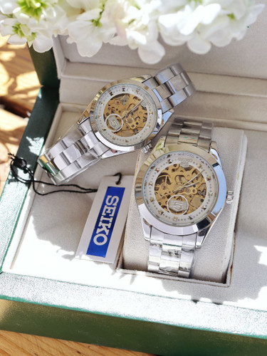 ست ساعت زنانه مردانه مارک سیکو5 اتومات بدون نیاز به باتری رنگ ثابت موتور باز پشت شیشه Seiko موتور ژاپن