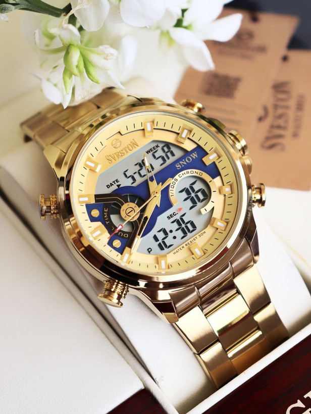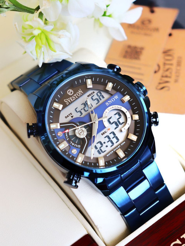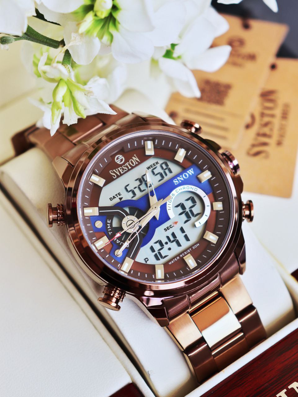 ساعت مردانه مارک سویستون رنگ ثابت دوزمانه الارم دار ضداب موتور ژاپن شب نما دار چراغ دار SVESTON