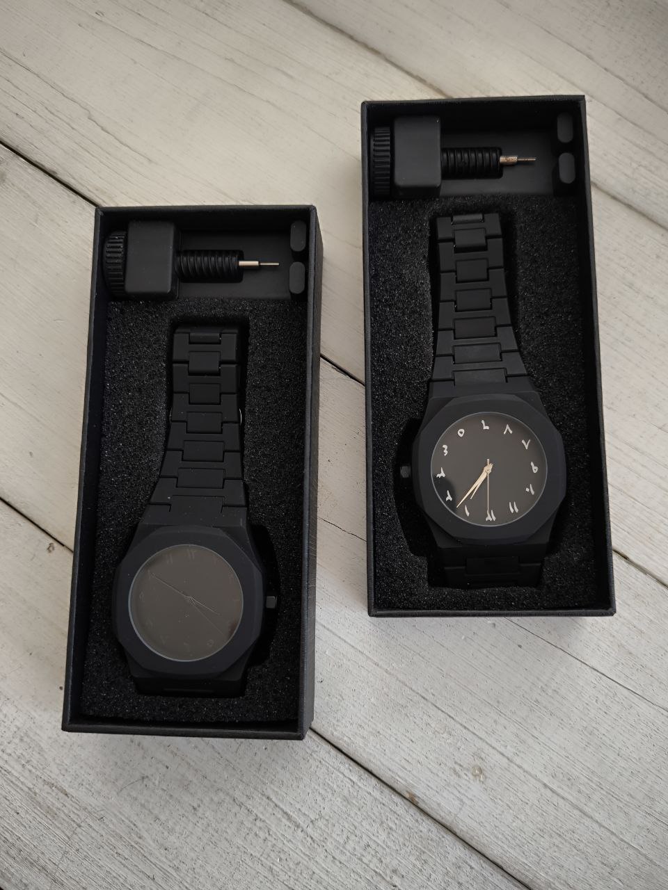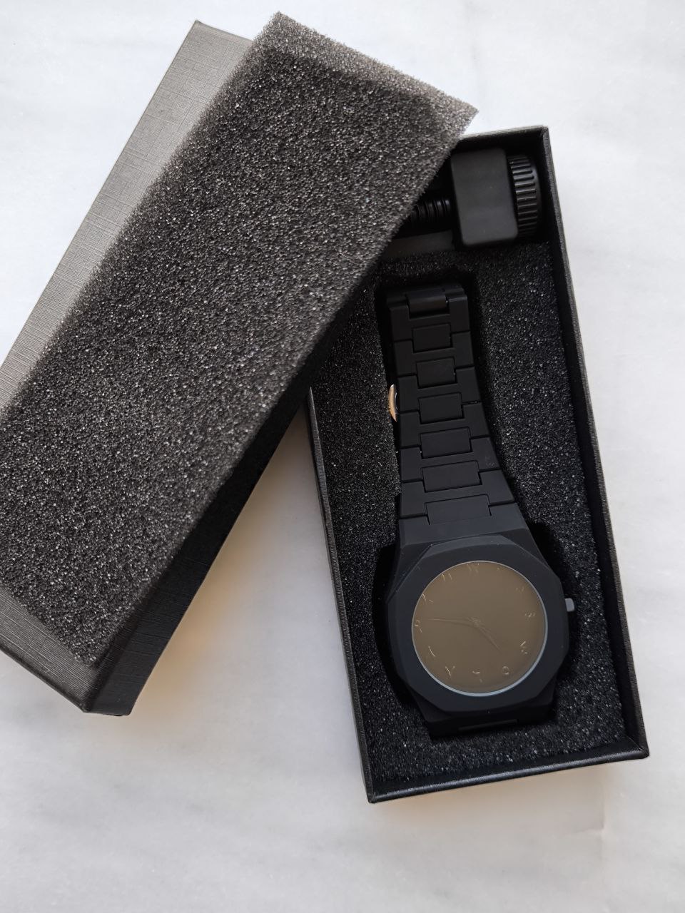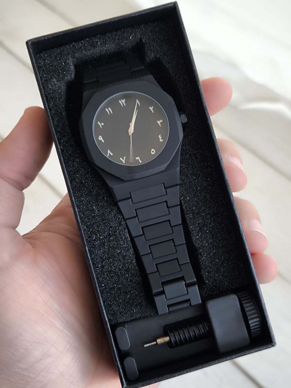 ساعت مردانه شیک با طراحی مشکی مات و اعداد عربی. همراه جعبه و پین درار