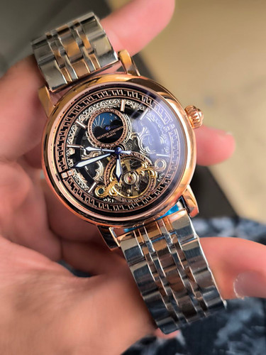 ساعت مردانه فلزی اتومات مارک vacheron اتومات بدون نیاز به باطری رنگ ثابت پشت شیشه ای دوقفله مخفی تقویم شب و روز